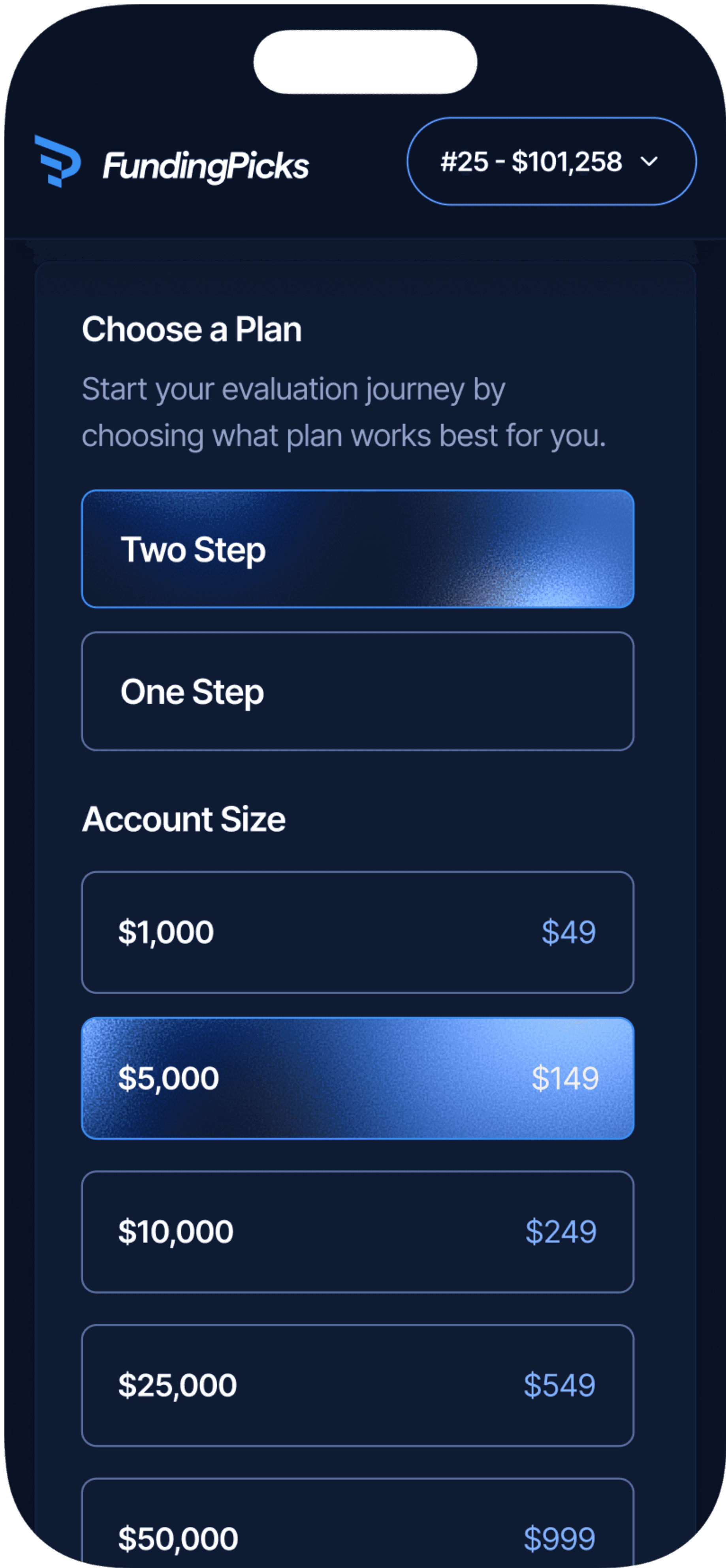 Choose between a 1-Step or 2-Step Challenge and select an account from $1K up to $100K. Pick the setup that fits your style and get started in minutes.